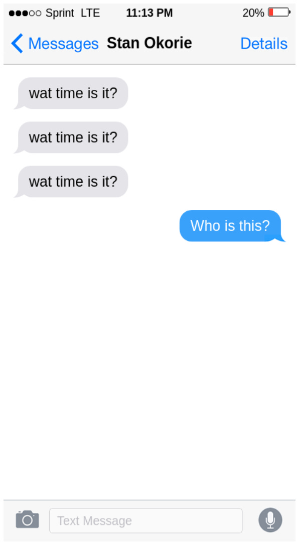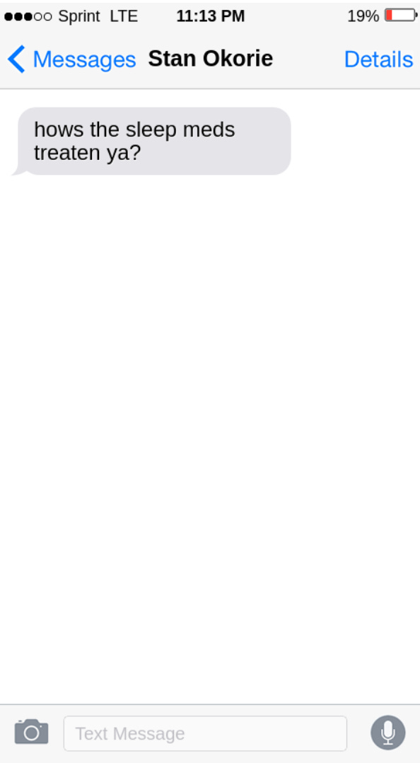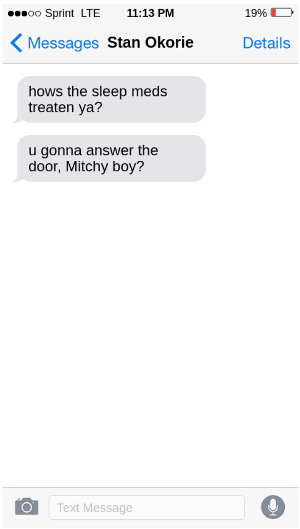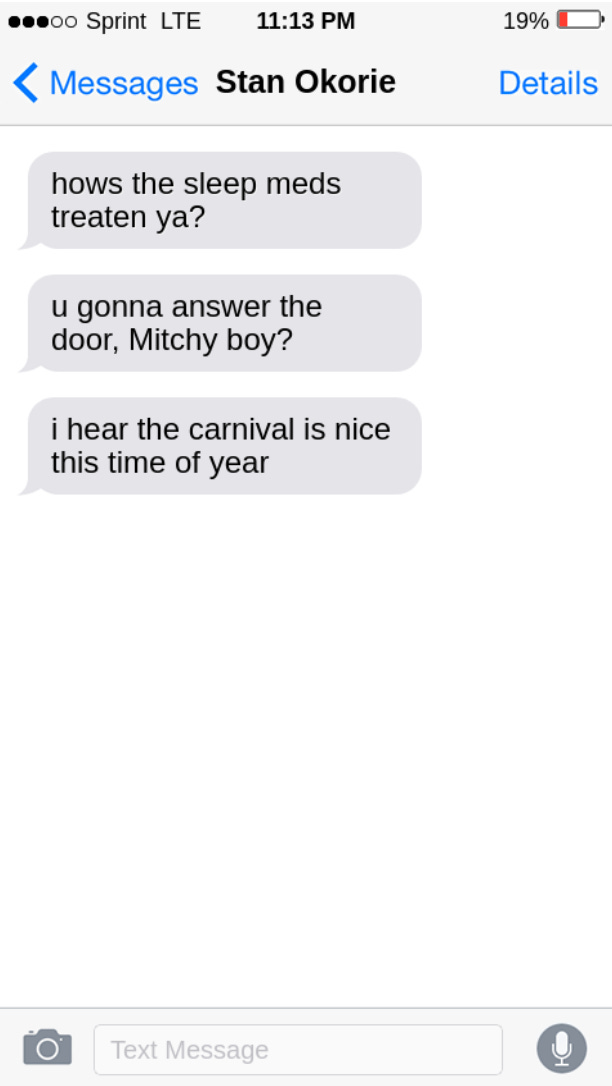 Mitch frowned. Frequently, Stan drunk-texted Mitch bizarre or nonsensical things. But this didn’t strike him as one of those instances. In fact, the string of texts didn’t sound like Stan at all. On a hunch, he replied:
