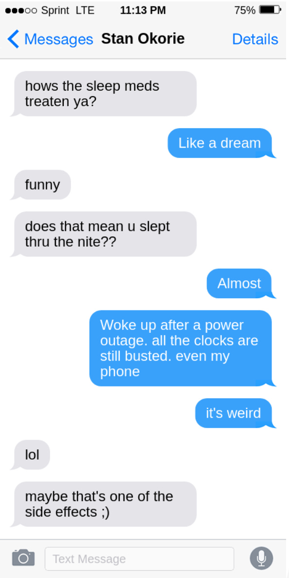 Mitch would like nothing more than to laugh with Stan and blame last night on a strange side effect of his sleep medication. However, in the light of day, the thing with the clocks seemed less like a hallucination. The timestamps on each message, both incoming and outgoing, were 11:13 p.m.